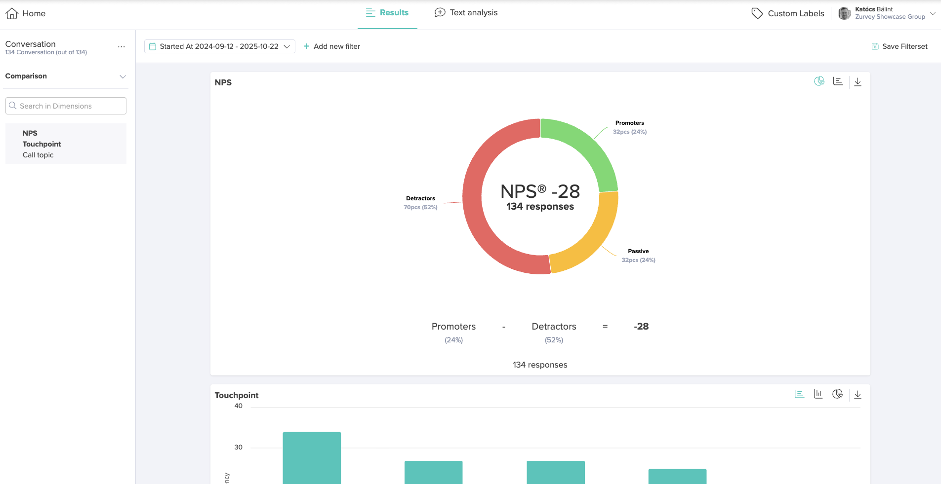 Based on the metadata and dimension setup, the dashboard may present visualizations such as NPS distribution, touchpoints, call direction distribution, support agent groups, silence length distribution, or call length distribution, among others.